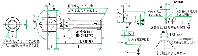 六角穴付きボルトの寸法はJIS B 1176で定められており、M3〜M30など多様な呼び径が存在する。ねじ部の長さや頭部の高さも規格により標準化されており、使用箇所に応じた選定が容易である。下記に寸法の参考値を示したが、詳細は六角穴付きボルトは、国際規格(ISO 4762)や日本工業規格(JIS B 1176)を参照すること。