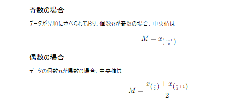中央値(Median)は、データを小さい順に並べたときに中央に位置する値を指す。データの分布に偏りがある場合や、極端な値の影響を受けにくいという特徴を持つため、平均値よりもデータの中心を適切に表すことができる場合がある。特に、収入や資産のように偏ったデータの分析においては、中央値が有用である。なお、飛び離れた値(はずれ値)が存在しなければ、平均値と中央値は近い値になる。