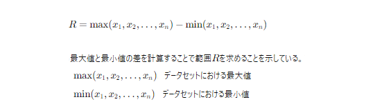 範囲(Range)は、データの最大値と最小値の差を示す指標である。データ全体のばらつきを簡単に把握することができるが、極端な値に大きく影響されるため、データの分布を正確に表す指標としては限界がある。範囲だけでは、データの内部構造や分布の特徴を十分に理解することは難しい。